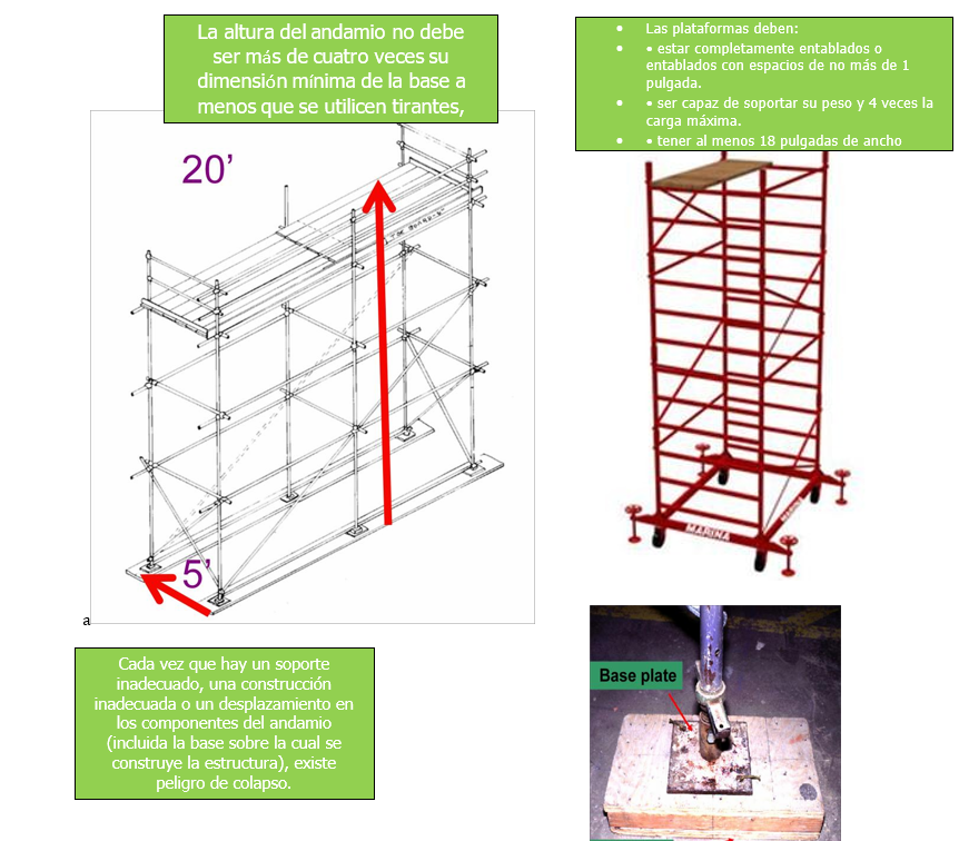 SIGA TODOS LOS CÓDIGOS Y ORDENANZAS ESTATALES, LOCALES Y FEDERALES Y REGLAMENTOS relacionados con los andamios porque pueden ser más restrictivos. Por ejemplo, los requisitos de altura o ancho pueden variar.
