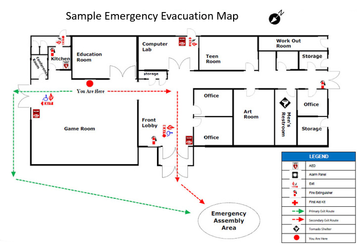 Emergency Exit in the Workplace An evacuation map for the building shall be conspicuously posted at all jobsites. It shows the location of exits, fire extinguishers, first aid kits, and where to assemble outside.