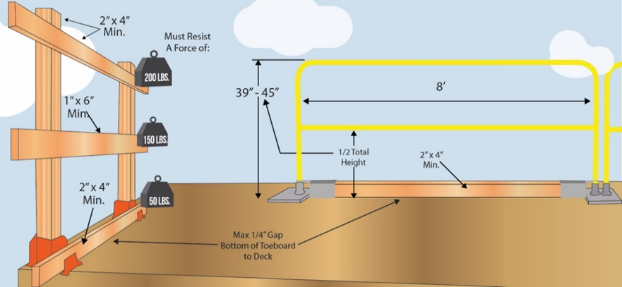 - Los rieles superiores y los rieles intermedios tendrán al menos un cuarto de pulgada de diámetro o espesor nominal para evitar cortes y laceraciones. Los rieles superiores de cable de acero deben estar señalizados a intervalos de no más de seis (6) pies con alta visibilidad. material.