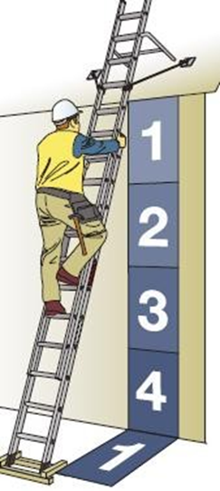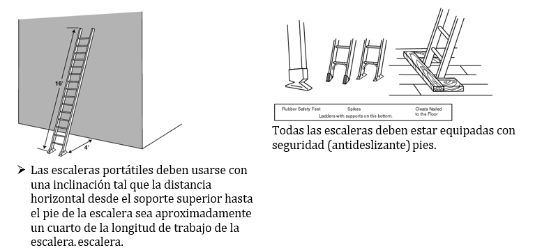 Las escaleras que no se sostienen por sí mismas, que deben apoyarse contra una pared u otro soporte, deben colocarse en un ángulo tal que la distancia horizontal desde el soporte superior hasta el pie de la escalera es sobre 1/4 el laboral longitud de el escalera. (Ver Cifra 2.)