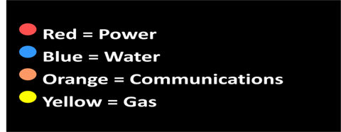 Excave con pala alrededor de zanjas o excavaciones que identifiquen los servicios públicos mediante marcas aplicables. Ver tabla de marcas de servicios públicos. abajo.